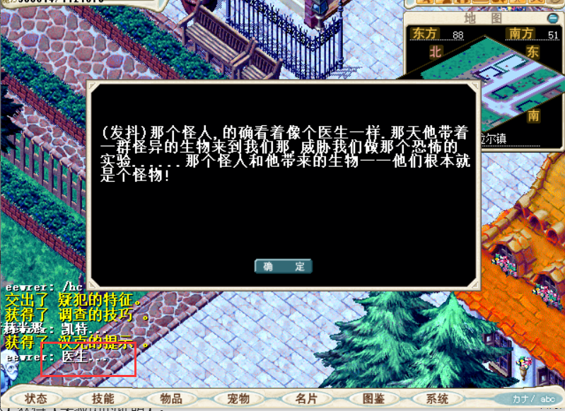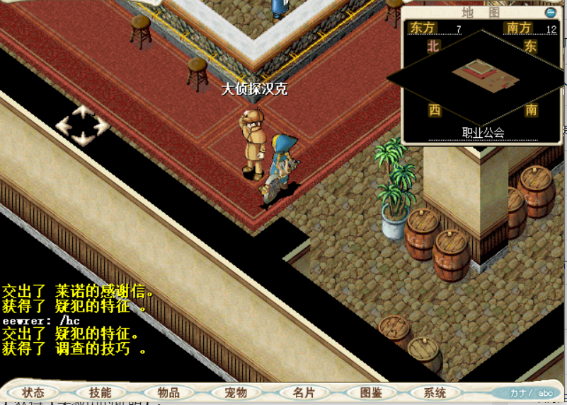 3.返回法兰城职业公会(73.60)与“大侦探汉克”(7.11)对话,交出【疑犯的特征】获得【调查的技巧】。