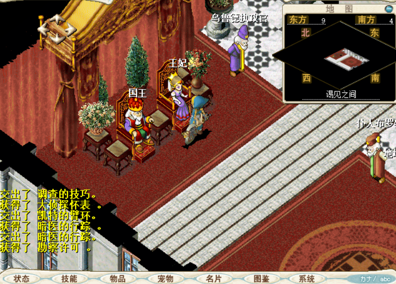 2.前往法兰城里谢里雅堡谒见之间与“王妃”对话,交出【暗医的行踪】获得【勘察许可】。